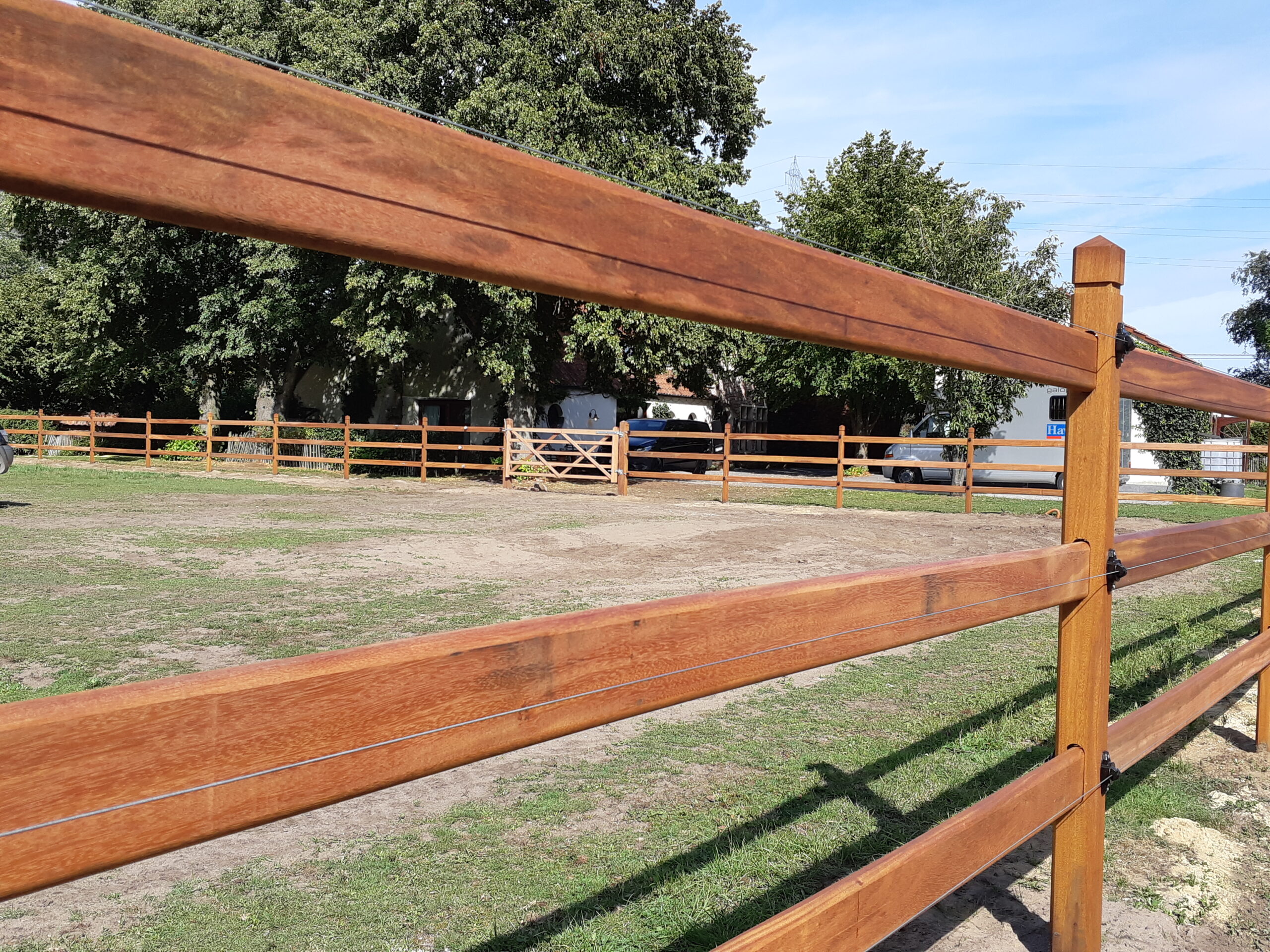 Tropisch hardhout is een stevige houtsoort met lange levensduur. We kunnen verschillende soorten aanbieden die telkens beschikbaar zijn in verschillende afwerkingen zodat de omheinig een klassevol uiterlijk krijgt. Deze omheiningen kunnen tevens uitgevoerd worden met elektrische beveiliging en draadgaas zodat ook kleinere dieren worden beschermd in de weide. Wij werken voornamelijk met Okan duurzaamheidsklasse 1. Het hout heeft een unieke geel tot lichtbruine kleur. Bij plaatsing worden de palen machinaal geheid.